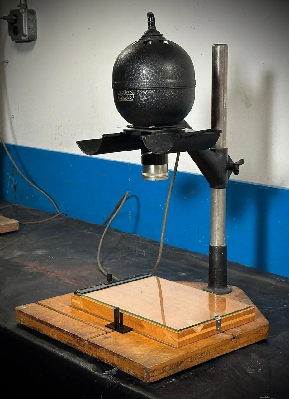 The enlarger was not much of a problem; with the rise of digital photography there are a slew of them floating around, often at bargain-basement prices. Darkroom equipment sells for very little, even vintage Leitz enlargers. After some hunting around Osterman was able to source a first model of Leitz variable enlarger from 1926. It was the third model Leitz made; the first two versions could only make one size of print.