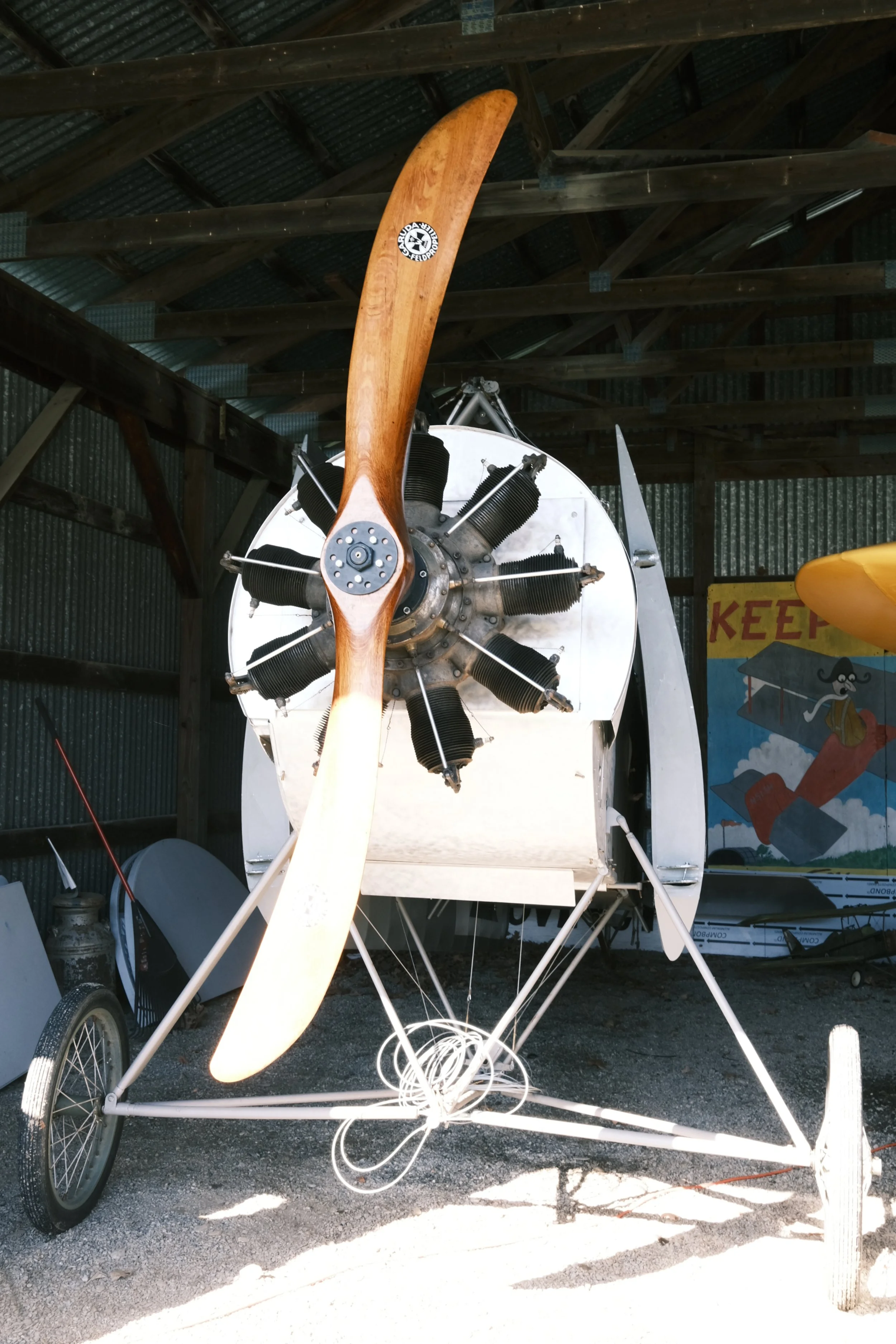 A Fokker Eindeker mono wing with the wings folded up tucked into one of the sheds at the Aerodrome. This airplane uses a rotary engine. With a rotary the whole engine casing rotates with the prop and the crankshaft is attached to the airframe. As you can imagine there is a fair amount of torque with this design.