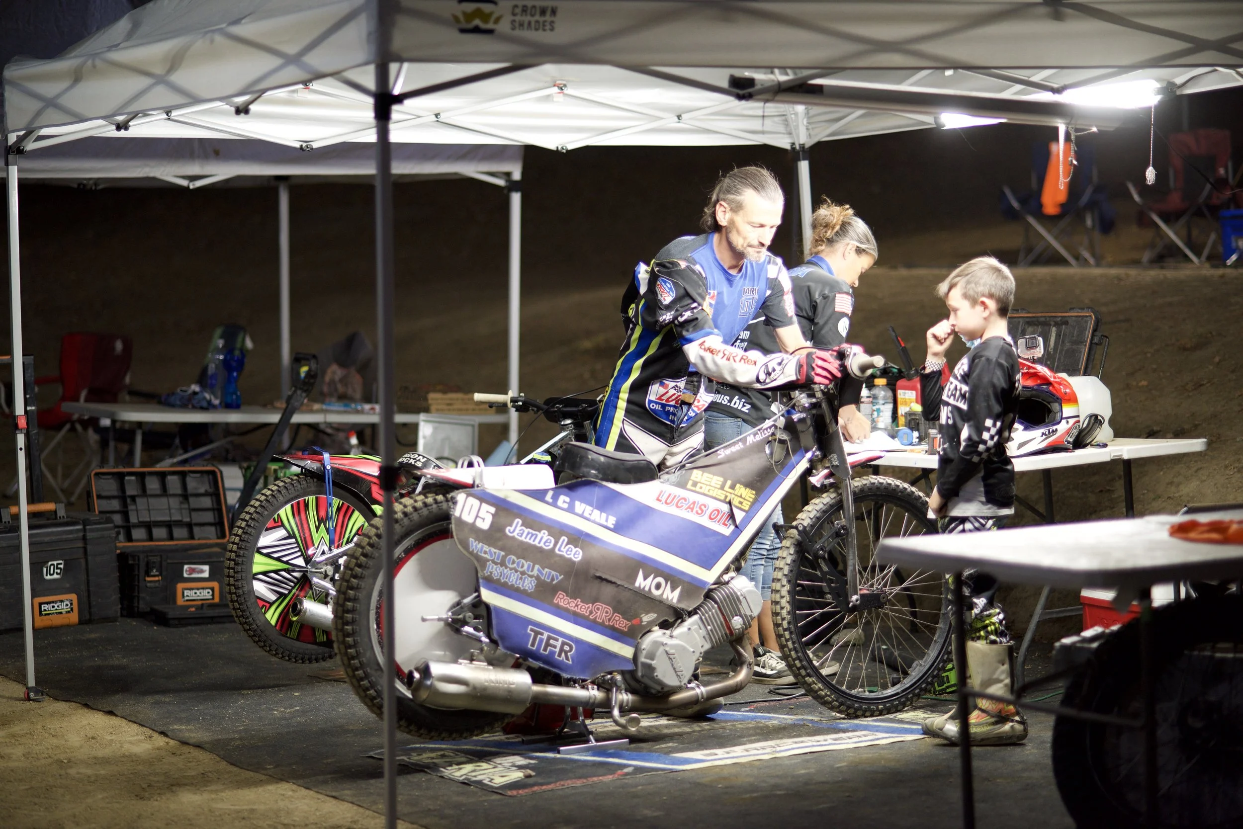 When you go behind the curtain at Fast Fridays speedway races in Auburn California the word that leaps to the fore is family. The pits are full of families and the stands are full of families. In many of the pits there are three and four generations of family. Mom and dad race like their parents before them.The kids, from the teenagers to the kindergarteners, are getting out and racing. The thing about Fast Fridays is the quality of the racing. National champions and world champions race at this little track in the foothills. The kids have the opportunity to see the best and learn from them and it pays off. Racing is an all day thing. The racers load in about noon, get setup and begin tuning the bikes. There is a lot of work to do before hitting the track. On this night photographer Miguel Guttierez and I had the opportunity to wander the whole facility. We bring you a story in photographs.